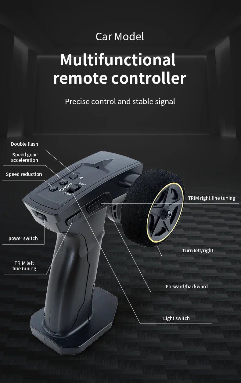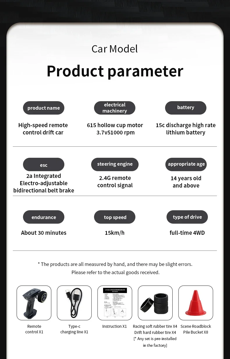 استمتع بمتعة الانجراف الاحترافية مع سيارة الانجراف هذه التي يتم التحكم بها عن بُعد بمقياس 1:43 . صُممت هذه السيارة بنظام دفع رباعي كامل الحجم ، وعناصر تحكم عالية الحساسية، وتوجيه دقيق، لتقدم انجرافات سلسة، وتسارعًا سريعًا، وأداءً واقعيًا في السباقات. صغيرة الحجم وقوية، مثالية للحلبات الداخلية أو اللعب التنافسي مع الأصدقاء.