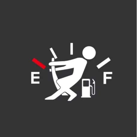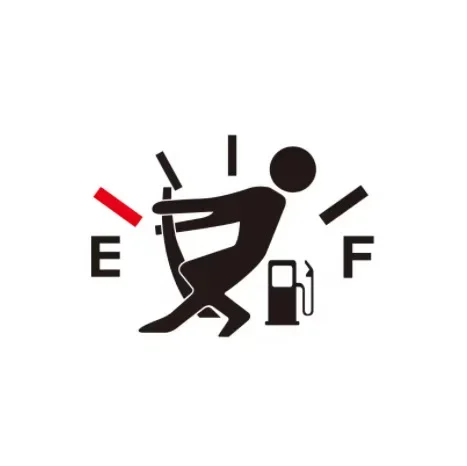 Design & Graphic: Features a variety of humorous fuel gauge concepts, including a figure struggling with the needle at "Empty" or a silhouette posing near the gauge. The designs use a bold black, white, and red color palette to ensure the graphic is instantly recognizable.