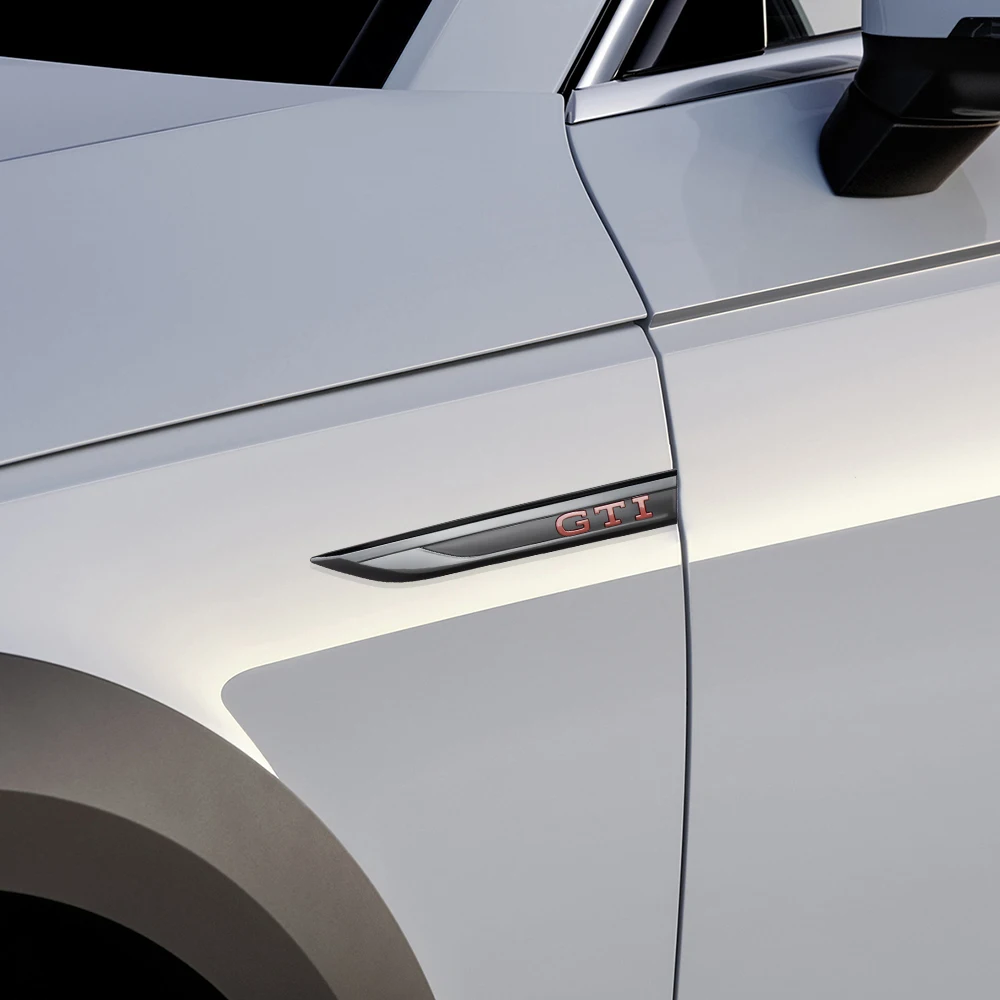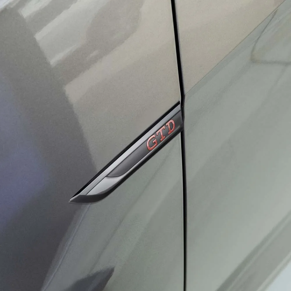 Design & Graphic: Features a streamlined, blade-style geometric design with embossed lettering including options for GTI and GTD. The graphics are rendered in high-contrast tones for maximum visibility.