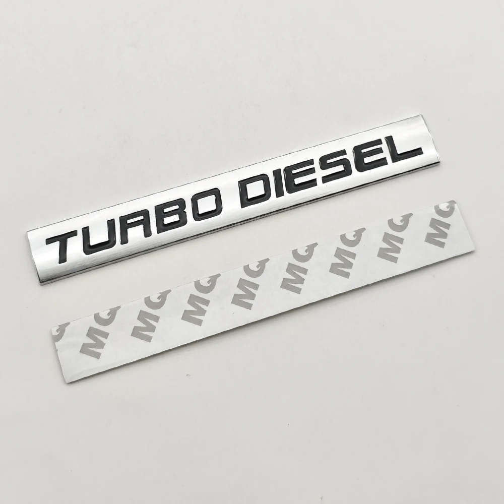 Un badge métallique conçu pour être appliqué à l'extérieur d'un véhicule, mettant en évidence le texte « TURBO DIESEL » pour désigner le type de moteur avec une finition métallique 3D élégante.