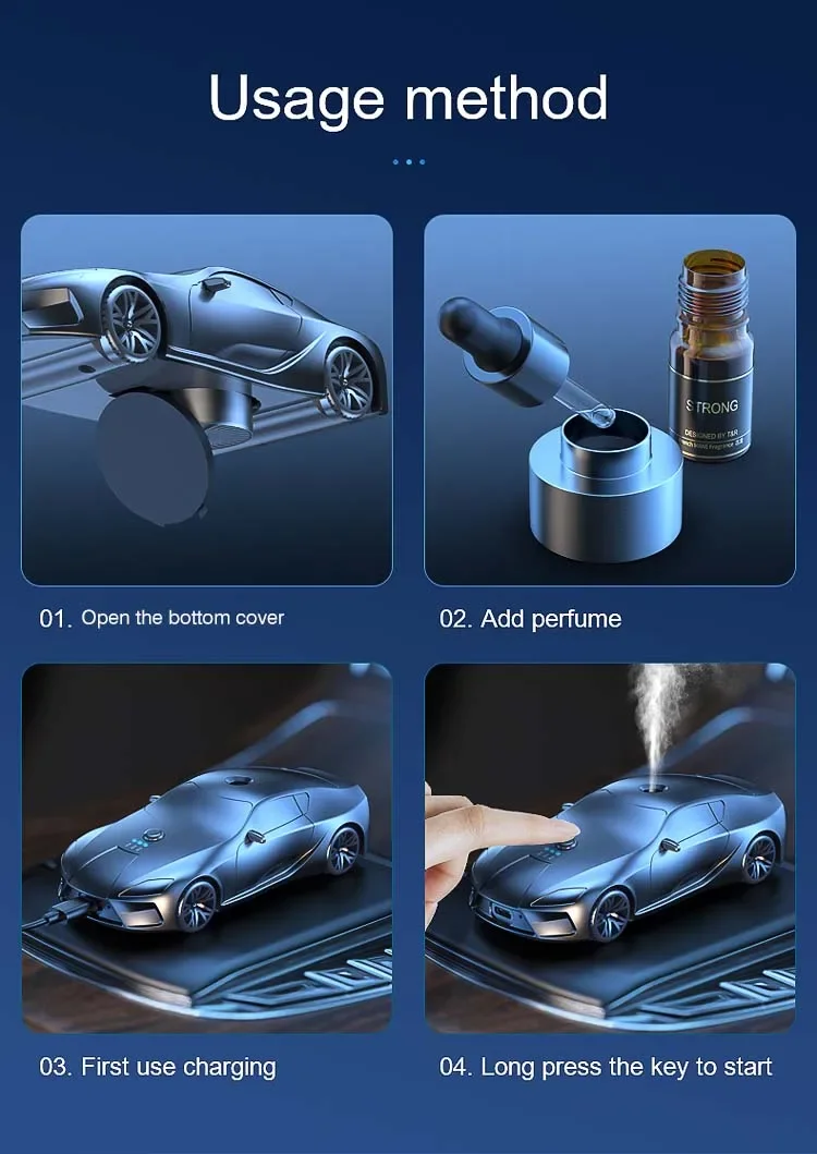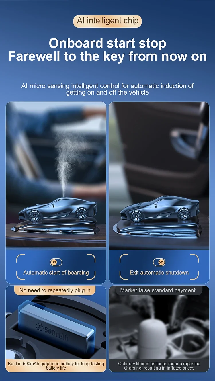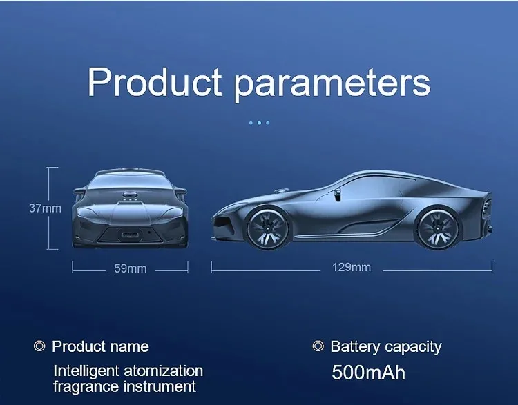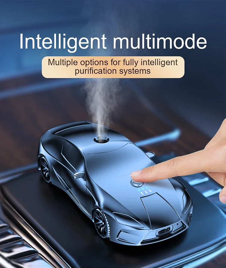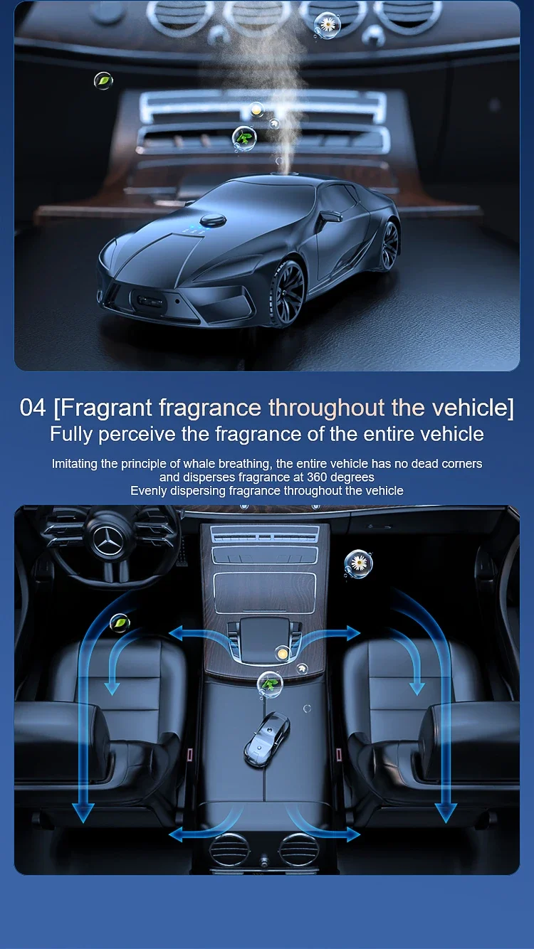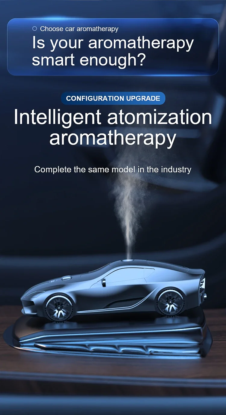 This product is an intelligent car aromatherapy diffuser designed to provide a continuous and uniform fragrance experience throughout your vehicle's interior. Shaped like a sleek modern sport coupe, this device is the perfect accessory for drivers seeking to combine high-end aesthetic appeal with advanced air-freshening technology.