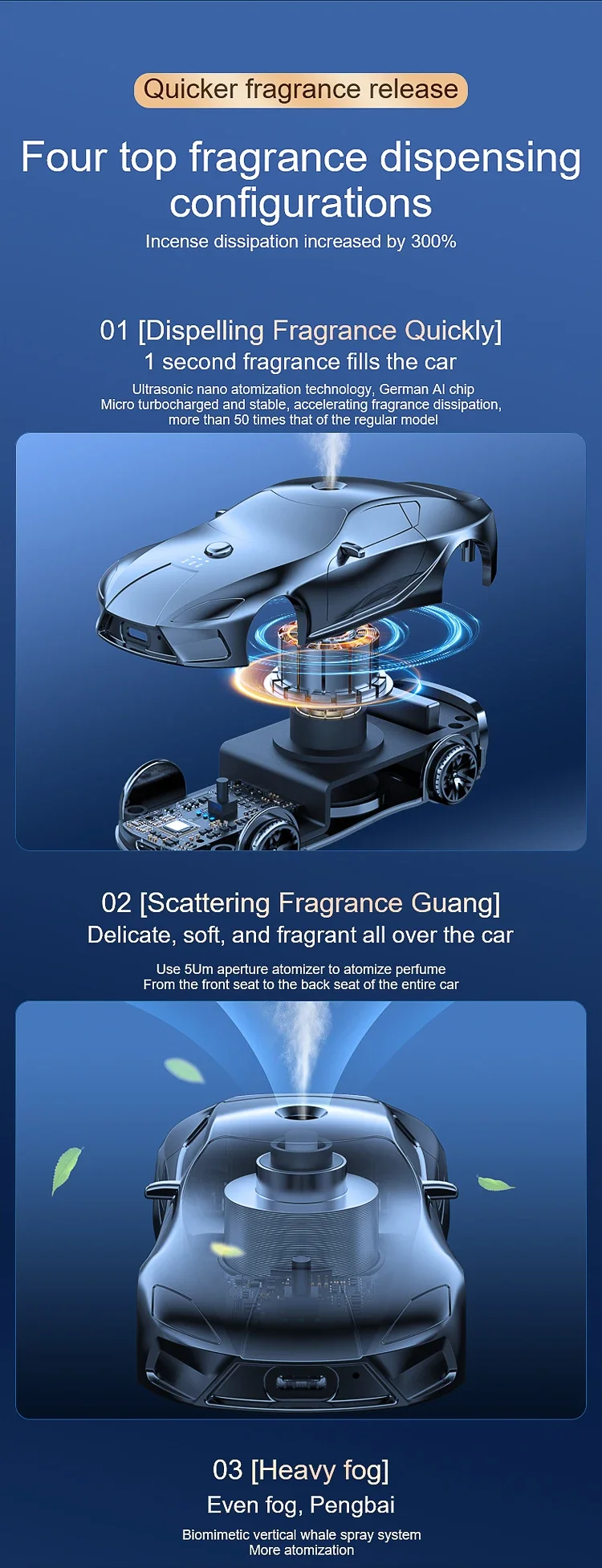 Style: A modern, high-tech performance accessory that utilizes a bionic vertical spray system to ensure fragrance is evenly diffused in a 360-degree radius.