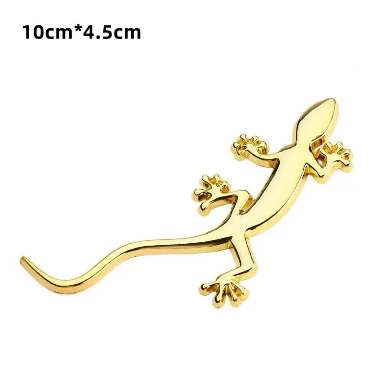 Un emblème décoratif en métal en forme de lézard ou de gecko, conçu pour être appliqué sur l'extérieur d'un véhicule pour une personnalisation unique et accrocheuse.