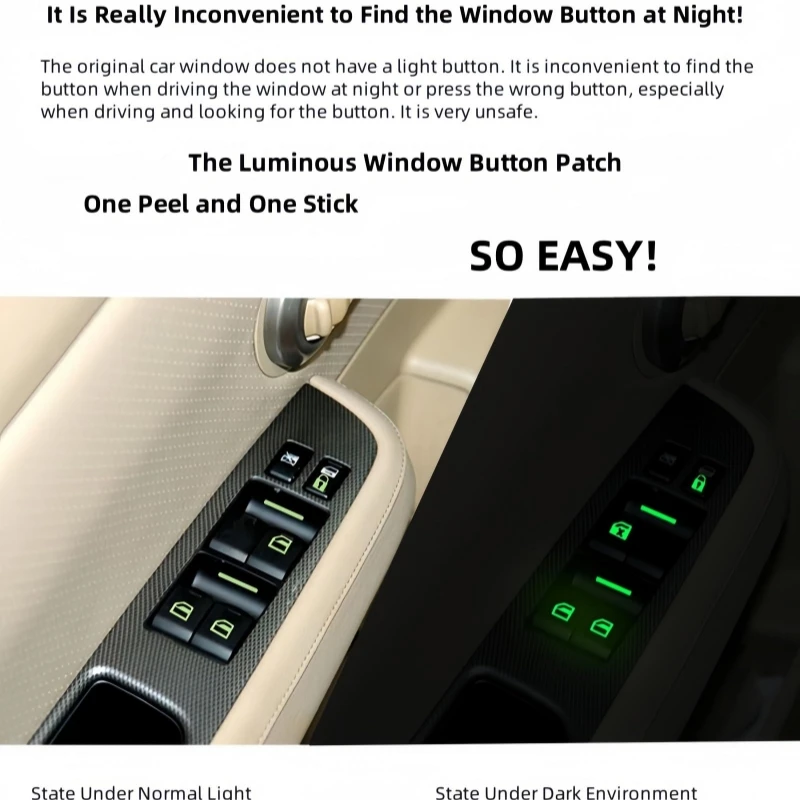 Aggiungi sia lo stile che la comodità agli interni dell'auto con questi Interruttore del finestrino dell'auto adesivi luminosi. Progettati per brillare nel buio, rendono i controlli del finestrino più facili da individuare di notte dando al tuo veicolo un tocco moderno e accattivante.