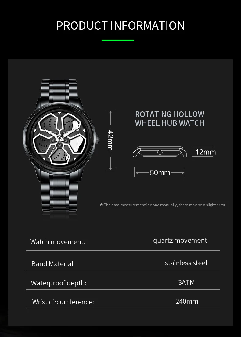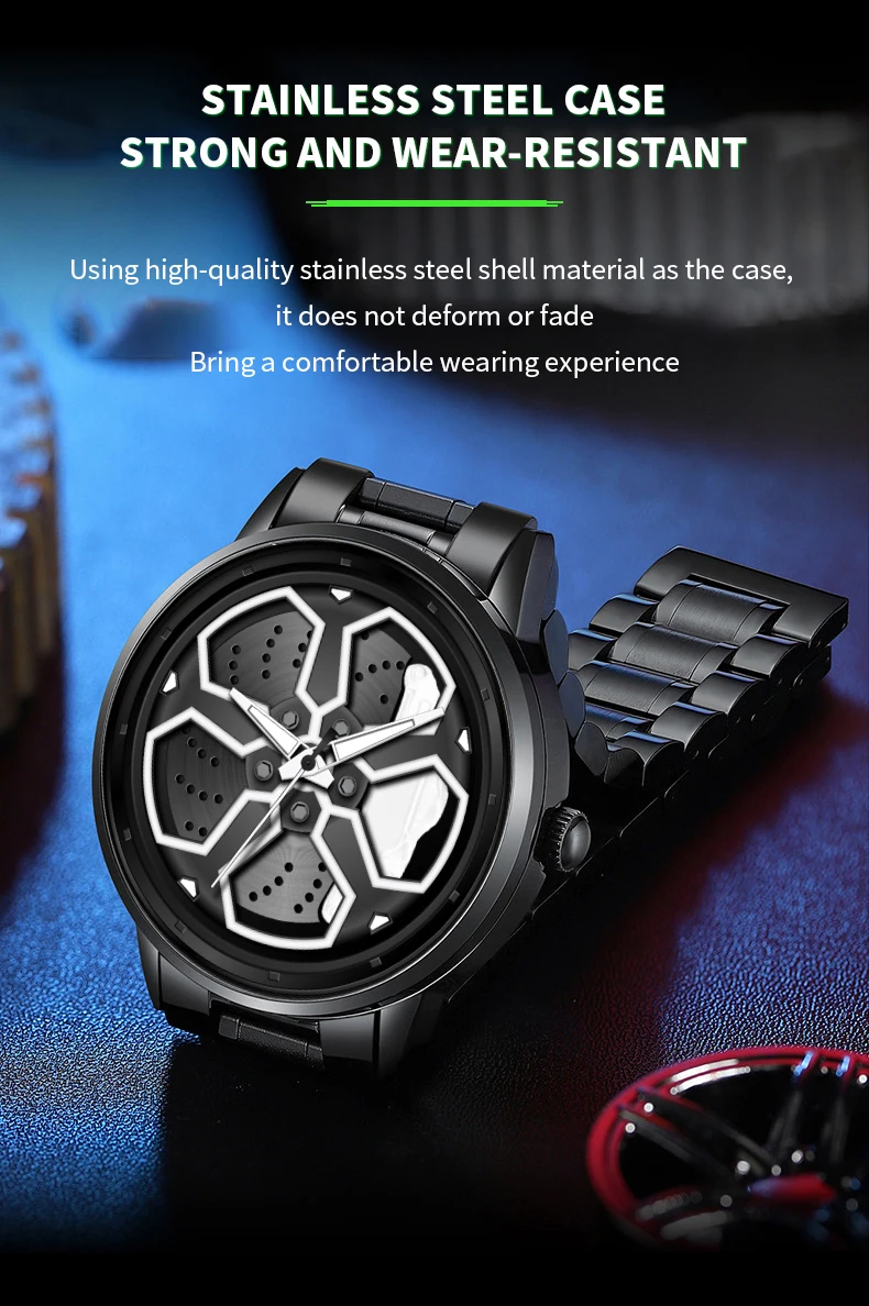 Why Choose This Product? Choose this spinning rim watch to express your passion for automotive culture in a unique and interactive way. Unlike standard timepieces, its rotating wheel design offers a tactile and visual experience that captures the essence of a car in motion. Built with high-quality materials and a focus on detail, it is more than just a watch—it is a conversation starter that reflects a lifestyle dedicated to performance and style.