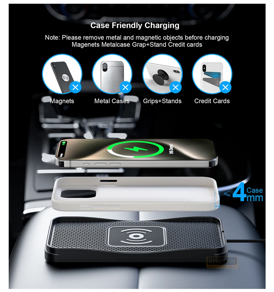 This charging pad is case-friendly, supporting phone cases up to 4mm thick, making it a practical solution for everyday use. Whether placed on the dashboard, center console, or armrest, its compact design ensures versatility and convenience without cluttering your car interior.