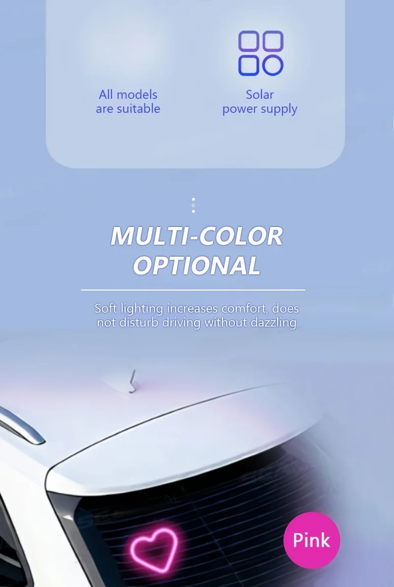 Design & Graphic: Features a classic neon heart silhouette that emits a bright, steady glow. They are available in a variety of vivid colors, including blue, red, purple, and pink, allowing you to customize your car's nighttime aesthetic.