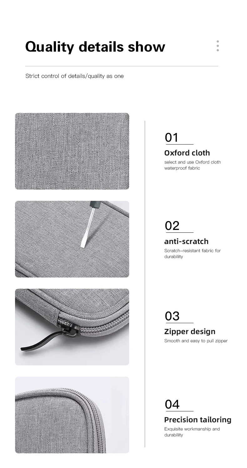 Material: Crafted from durable, high-density fabric that offers protection for electronics while maintaining a soft-touch exterior. The high-quality zipper ensures smooth operation and long-term reliability.