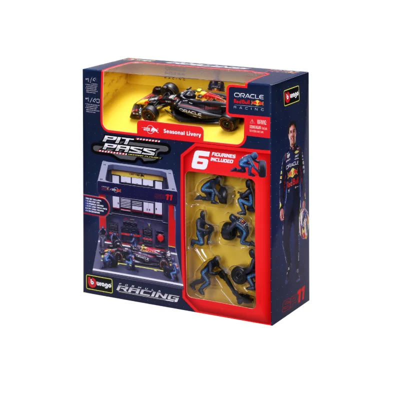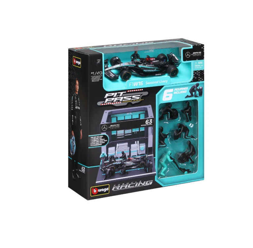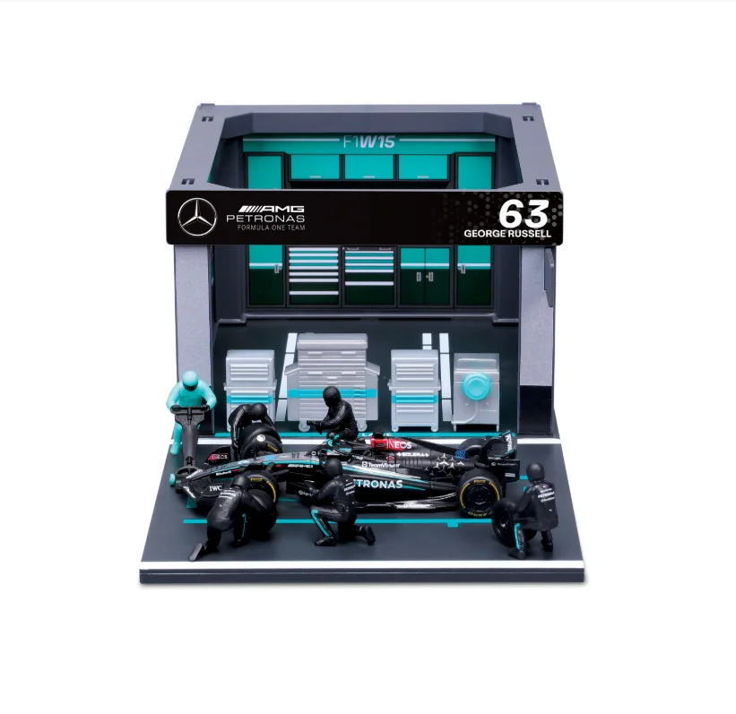 Interactive Detailing: Engineered with six highly articulated pit crew figurines in team-specific uniforms, posed in realistic servicing positions such as tire changes and front-jack operation. The set includes a simulated garage floor and rear storage units for a complete paddock aesthetic.