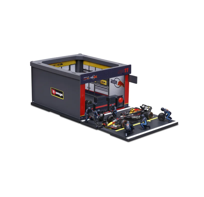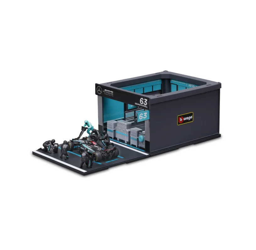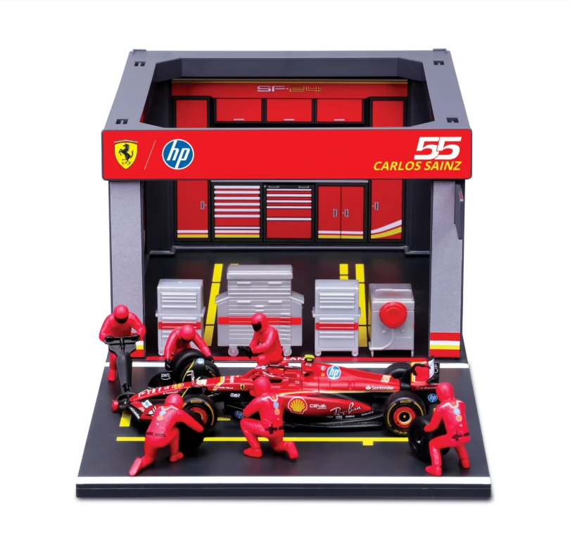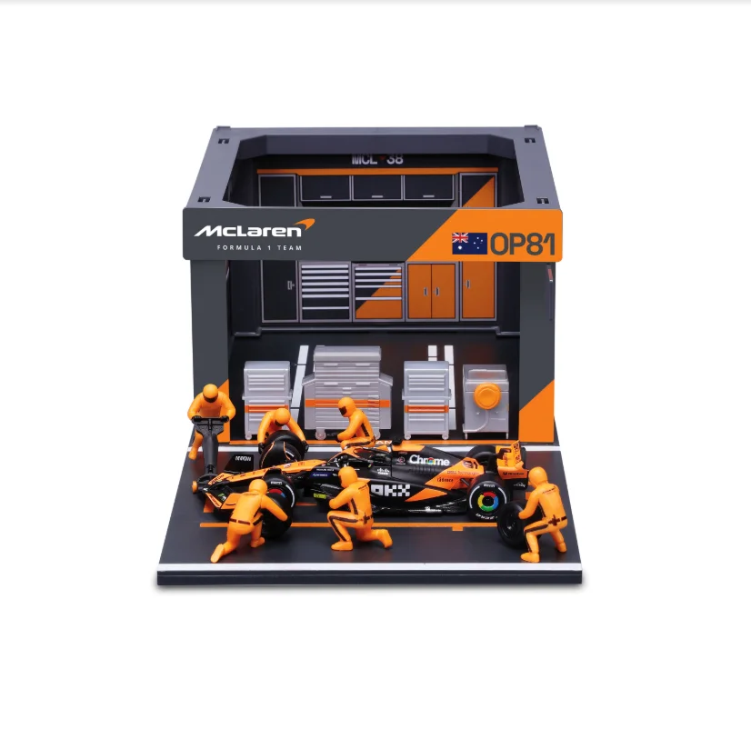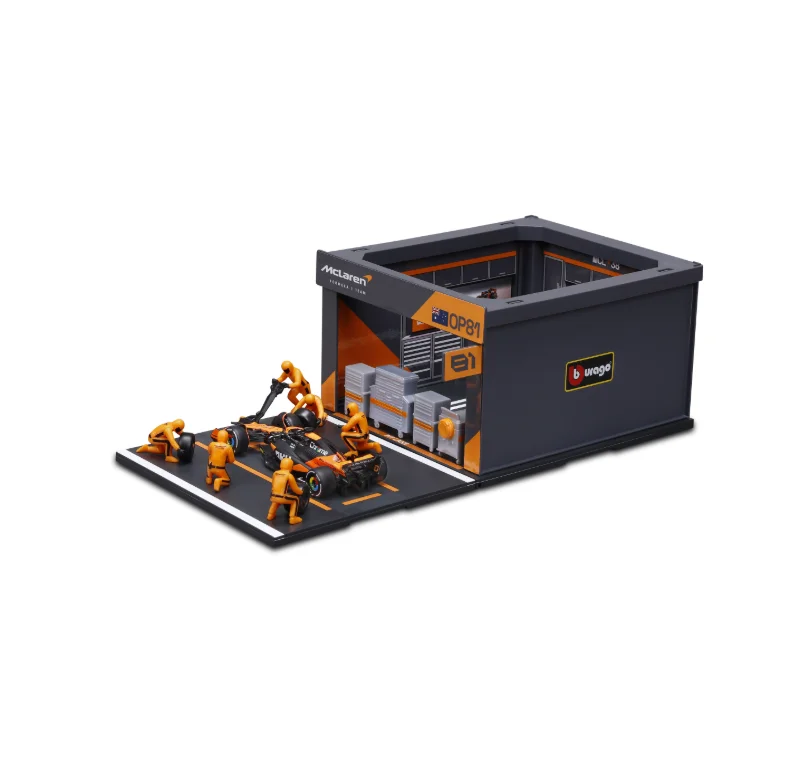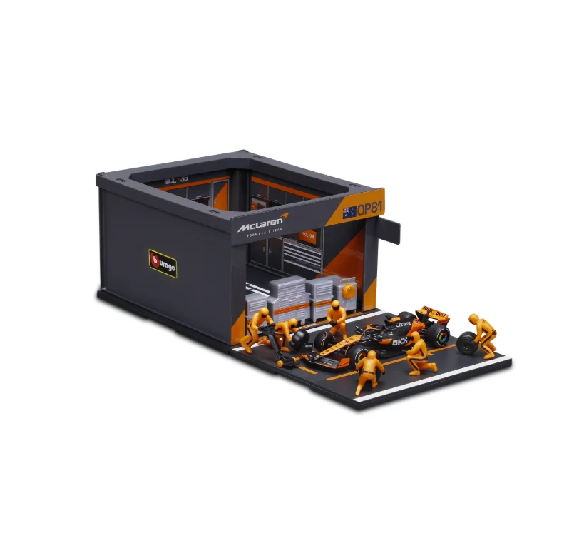 Design & Graphic: Features authentic team-specific garage environments including the iconic racing scarlet of the Italian team and the vibrant orange and black of the championship-winning British stable. Each set includes precision-applied technical graphics, simulated tool chests, and overhead lighting rigs.